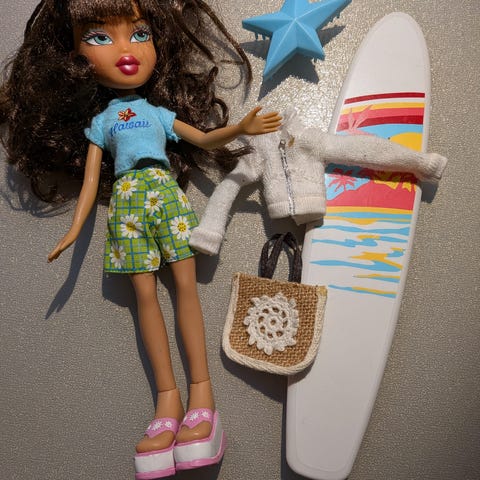 Bratz med långt hår och målad sminkning. Till dockan följer ett extra klädes-set med utsvängda blå jeans, ett par extra högklackade skor samt en brun axelväska med fransar. Passar för lek och samlande av Bratz-dockor.