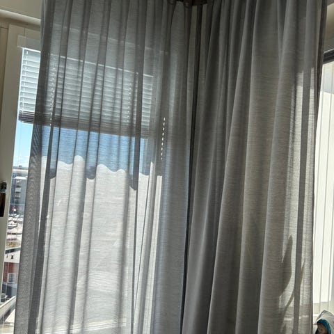 3 st/ 3 fönster/IKEA panelgardin med skena. Panelerna löper i en takmonterad skena med flera spår för att kunna skjutas åt sidan eller överlappa varandra. Passar för montering framför fönster eller som rumsavdelare. Färg och exakta mått framgår inte, men skenan är i ljus metallfärg. Panelerna är i textilmaterial och fästs i skenan med medföljande beslag. /Finns 3 skenor med 12 st panelgardiner i grått, vit, beige/