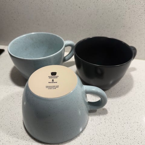Ernst tekanna och fyra matchande te-muggar i grå & ljusgrå keramik, med citat ”i det enkla” på både kannan och muggarna.