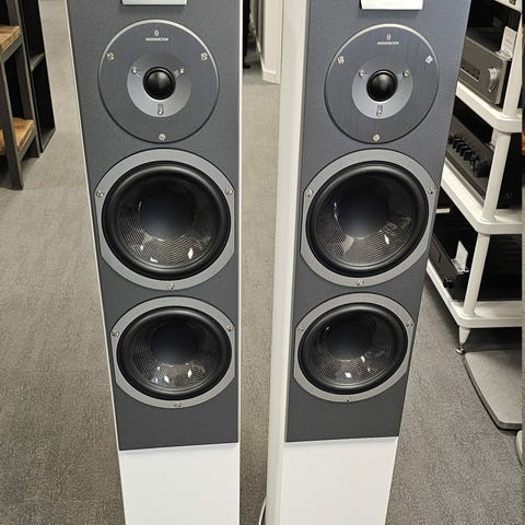 Väldigt bra skick förutom en skada i bakre hörn av en golvhögtalarnas fotplattor, endast kosmetiskt.