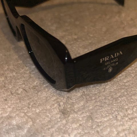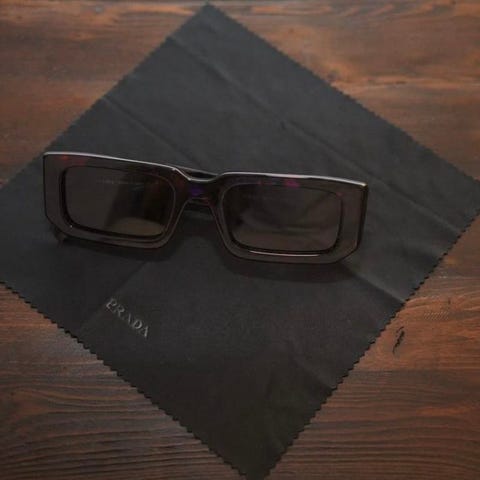 Prada glasögon unisex med rektangulja bågar i transparent plast. Bågarna har diskret logotyp på skalmen. Passar för både dam och herr och kan användas som glasögon med styrka eller bytas till solglaslins hos optiker beroende på behov.