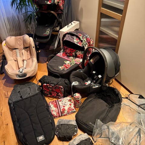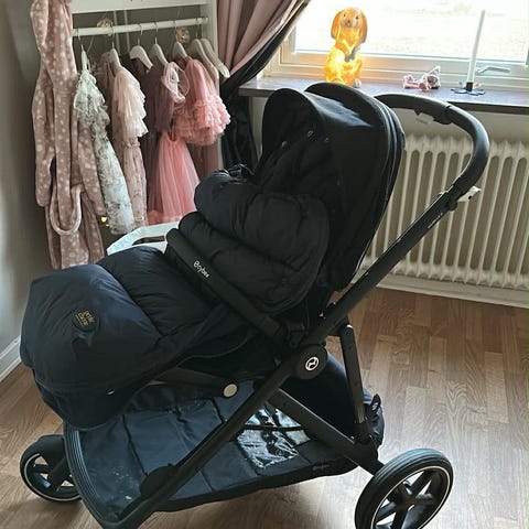Har även en footsack som är grön och en beige åkpåse, båda från Emmaljunga