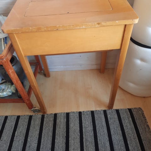 Symaskin Singer med underrede i järn och ”inbyggd låda” där maskinen förvaras.