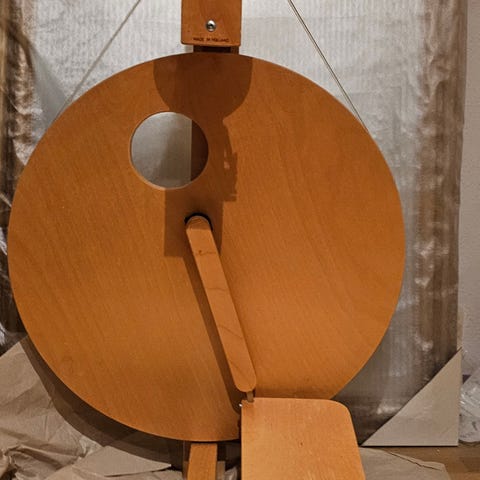 Säljer en mycket vacker och handgjord äldre knäpphärvel (garnvinda/garnmätare) i trä med vev och mekanisk räknetavla. Verktyget användes förr i tiden för att vinda upp och mäta längden på färdigspunnet garn.