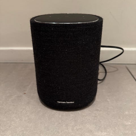 Harman Kardon högtalare i svart utförande. Rund, fristående modell med nätfront och synlig logotyp på framsidan. Levereras med nätadapter enligt bild. Passar för uppspelning av ljud från exempelvis dator, mobil eller annan ljudkälla via kompatibel anslutning beroende på modellens specifikationer.