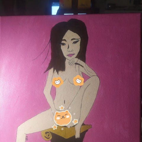 Tavla med porträttmotiv mot svart bakgrund. Motivet föreställer ett stiliserat ansikte i grå toner med mörkt hår, röda detaljer vid ögonen och rosa läppar. Rektangulär målning som kan användas som väggdekoration i exempelvis vardagsrum, sovrum eller hall. Målat av mig själv.