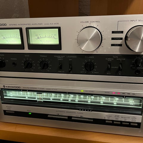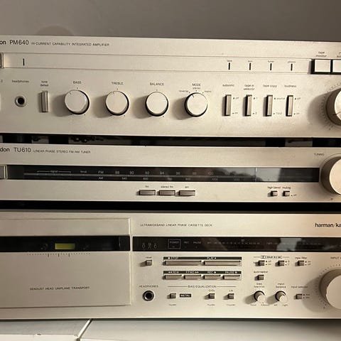 Sony STR-K740P och STR-KG700 med högtalare/sub, plus Sharp/Kenwood/Panasonic stereo.