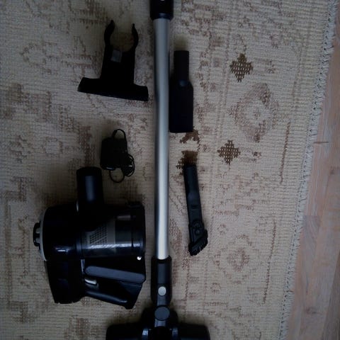 Skaftdammsugare med 24V MAX effekt. Denna dammsugare är designad för att vara enkel att använda och förvara. Den är utrustad med ett avtagbart handtag för flexibel rengöring och kan enkelt monteras på väggen för smidig förvaring. All tillbehör följer med. Behöver kollas! Batteri lyser några sekunder vid uppladdning men sedan lägger den av. Annars är den i nytt skick. Kan ev skicka delar av maskinen