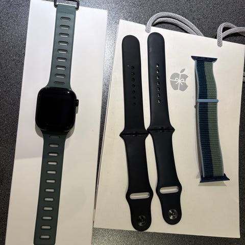 Den är sparsamt använd och fungerar perfekt. Apple Watch smartklocka 41 serie 9 med tillhörande laddkabel och beige armband. I förpackningen ingår klockan, magnetisk laddare med kabel samt utbytbart armband.