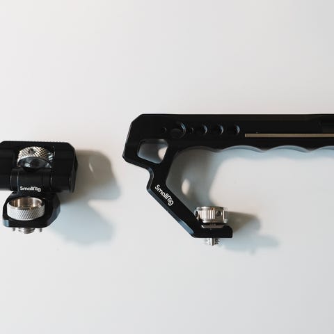 Ulanzi kamerahandtag i svart aluminium. Handtaget monteras på kamerabur eller kamerahus och ger extra grepp vid filmning eller fotografering. Flera gängade hål längs handtaget för montering av tillbehör som mikrofon, belysning eller monitor. Fästskruv på sidan för enkel montering och justering på kamerariggen.
