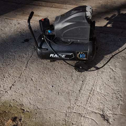Kompressor Pela. Utrustad med hjul och handtag för enklare förflyttning. Lämplig för användning i garage, verkstad eller hobbybruk för exempelvis avblåsning och pumpning av däck. Lite långsam men når fullt tryck. Driver mindre spikpistol utmärkt.