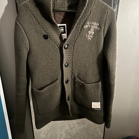 Mjuk och snygg kofta från Polo Ralph Lauren med sjalkrage, i mörkgrå melerad färg och storlek L. Knäppning med knappar fram och två fickor gör den perfekt som vardags- eller jobbkofta över skjorta eller t‑shirt.