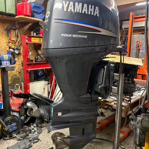 Yamaha 75AE utombordare. Bensinmotor med utombordskonstruktion avsedd för montering på akterspegel. Motorn har integrerad växel- och styrmekanik samt propeller och rigg enligt bilderna. Passar som drivkälla till mindre och medelstora fritidsbåtar där en 75 hk utombordsmotor är lämplig. Märkplåt med modellbeteckning Yamaha 75AE finns på motorns sida. Manuell tilt på, komplett reglage med 2st nycklar.