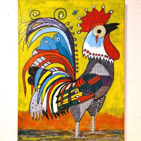 Tavla med hundmotiv av okänd konstnär. Motivet föreställer en tecknad gul och svart hund med stora ögon mot en orange och röd bakgrund med dekorativa mönster. Verket är utfört i en färgstark, lekfull. Mått 30x30cm . Hämtas vid Karlaplan