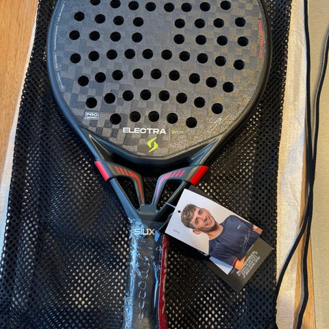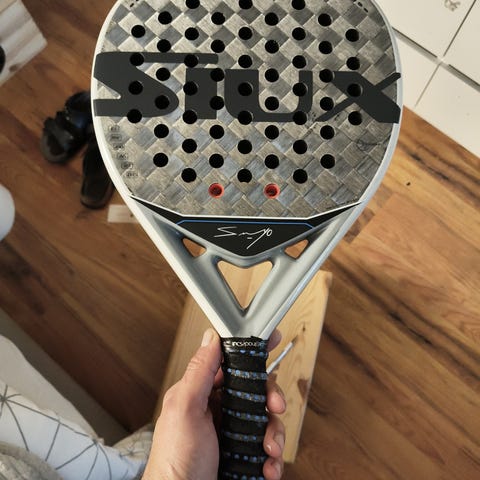 Fint racket i använt skick. Finns några märken under det nya ramskyddet. Inga sprickor. Vikt ca 355 gram