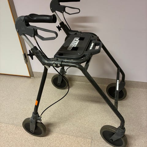 Carl-Oskar rollator med fyra hjul, röd ram och svart sits. Utrustad med handbromsar, korghylla under sitsen och stora hjul som ger stabil gång både inomhus och utomhus. Bruksanvisning medföljer enligt bild.