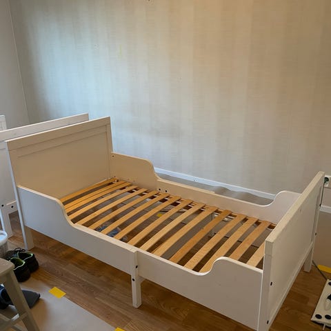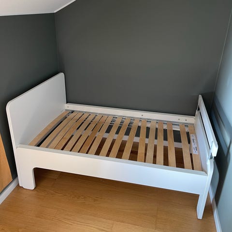 ILVA enkelsäng i vit färg 90 x 200 cm med ribbotten i trä. Sängen har enkel, rak design med rundad huvud- och fotgavel samt ben i trä. Passar barn ca 4-10 år. Madrass ingår inte. Hämtas på Norra Fäladen i Lund, först till kvarn