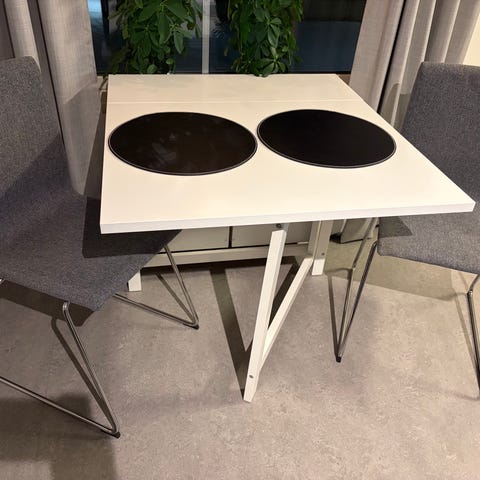 Mycket fint rejält matbord klaff/slagbord i trä med naturfärgad bordsskiva och ben. Bordet har två klaffar som kan fällas upp eller ned för att anpassa storleken efter behov. Passar som matbord eller köksbord i mindre utrymmen där flexibel bordsyta önskas.