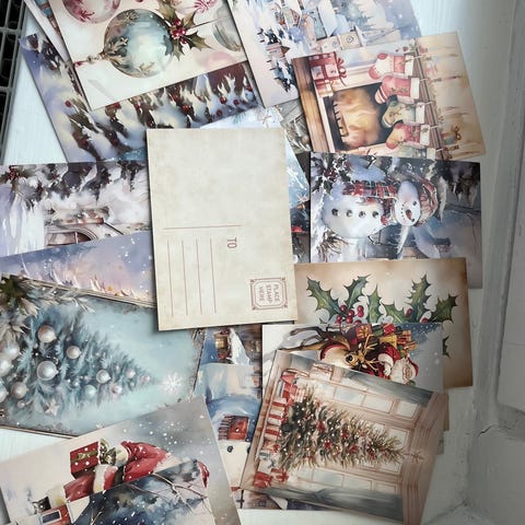 Julkort med blandade motiv i flerpack. Kort med vinterlandskap, julgranar och texten "Merry Christmas" i olika färger och utföranden. Samtliga kort är vikbara och har insida utan tryck för egen hälsning. Lämpliga att använda som julhälsningar eller gratulationskort under julperioden. Ca 47 stycken!🤗