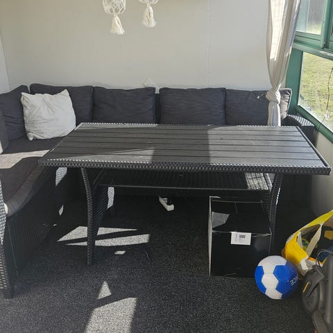 Det är ca 1–2 år gammalt och har stått på inglasad balkong hela tiden, så det är väldigt fint bevarat. Några små märken finns på bordet och det är någon enstaka fläck på dynorna efter vanlig användning men helhetsintrycket är jättefint.