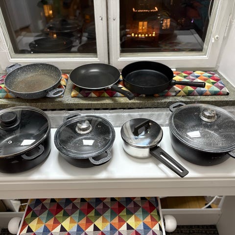 köksset – tallrikar, glas, kastruller, stekpanna, redskap & knivar