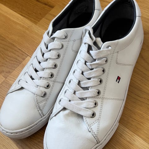 Tommy Hilfiger sneakers i storlek 41. Låga sneakers i blå färg med vit sula och vita skosnören. Diskret Tommy Hilfiger-logga på sidan och detaljer i rött, vitt och blått. Passar som vardagssko och fritidssko.