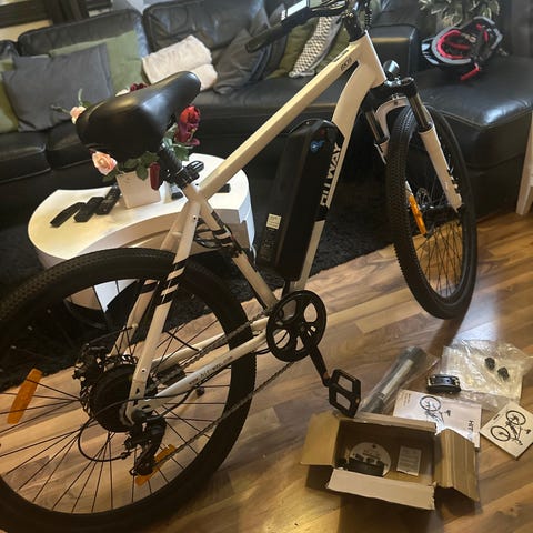 Elcykel med integrerat batteri, 2 år gammal. Oanvänd efter inköpet för 6 månader sedan. Stått inomhus. Laddbart framlyse och baklyset på batteri.
