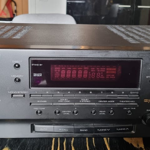 Fjärrkontroll medföljer, med knappar för volym, kanalval, uppspelning och andra funktioner kopplade till receivern.