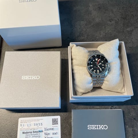 Seiko herrklocka armbandsur i rostfritt stål med länkarmband. Klockan har rund boett, blå urtavla med tydliga indexmarkeringar och datumvisning. Vridbar bezel i svart och blått. Levereras med originalask och Seiko-presentpåse enligt bild. Lämplig som vardags- och fritidsklocka för män.