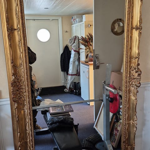 Rektangulär spegel i helkroppsmodell med dekorativ guldram i massivt trä. Mått 162x72.