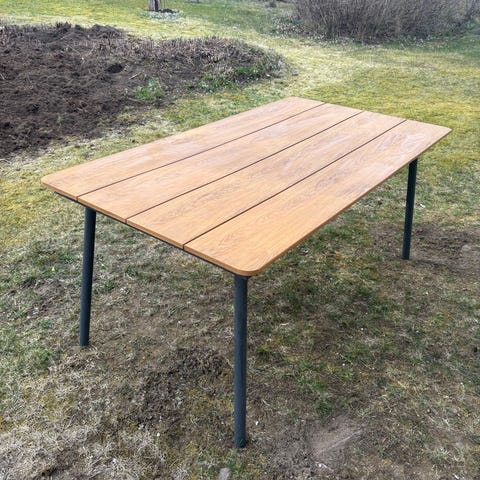 Bordsskiva av trä, underrede av metall. Lämpligt till uterummet, balkongen, husvagnens förtält eller kanske ett extra bord att plocka fram vid behov såväl inom-som utomhus. Skickas ej!