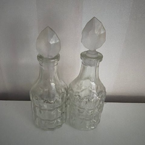 Den smala karaff är till för vinäger eller olja. Tyvärr en flisa av på den uppe vid glasknoppen.