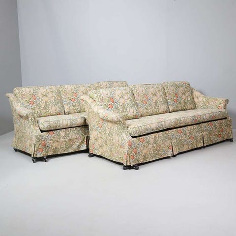 Tyget är i klassisk gobelängstil med motiv av 1700-talsfigurer och blommor, i mjuka dova toner som passar både antikt och modernt inredda hem. Träramarna har vackert snidade lejonfötter, rokokoinspirerade former och flätade sidor i rotting.