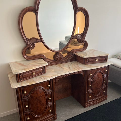 Toalettspegel med bord och pall i trä. Möbeln har spegel med snidad träram, överdel med liten låda samt bordsskiva, troligen med glasskiva ovanpå. Under bordsskivan finns en extra låda och förvaring bakom ljusa tygdraperier. Till möbeln hör en stoppad pall med brun sits. Passar som sminkbord eller hallmöbel med både spegel och förvaringsmöjligheter.obs Strindbergs lampan ingår ej , men kan säljas separat om intresse finns