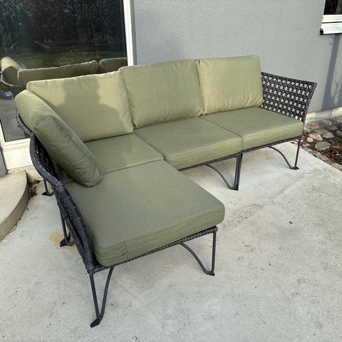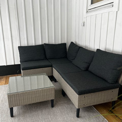 Hörnsoffa för utomhusbruk i grå konstrotting. Består av flera moduler som kan ställas ihop till en större soffgrupp samt en fristående del som kan användas som fåtölj eller förlängning. Passar på altan, uteplats eller större balkong. Sitsar och ryggstöd är utformade för användning med lösa dynor (dem e svarta)