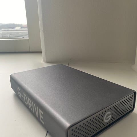 SanDisk Professional G-Drive hårddisk med kapacitet på 12 TB. Lämplig för lagring och säkerhetskopiering av filer.