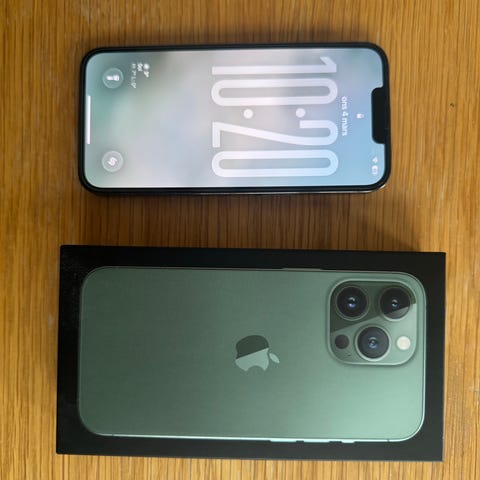 Apple iPhone 13 Pro mobiltelefon med 256 GB lagringsutrymme. Modellen har trippelkamera på baksidan och platt skärm på framsidan. Färgen är blå. Batterikapacitet 79%.
