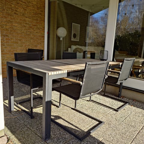 Matgrupp för utomhusbruk bestående av ett rektangulärt bord och åtta stolar. Bordsskiva i teak med benstativ i vit metall. Stolar med vit metallram, hög rygg och sits i ljus textilväv anpassad för utomhusmiljö. Passar som utebord på altan, balkong eller i trädgård.