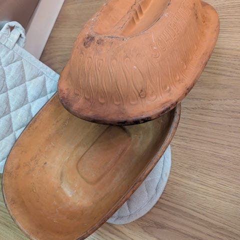 Lergryta med dekorativt mönster runt kanten. Avsedd för matlagning i ugn, exempelvis stekar, grytor eller långkok. Färgen är klassisk terrakotta och materialet är oglaserad keramik/lera som ger jämn värmefördelning vid tillagning.