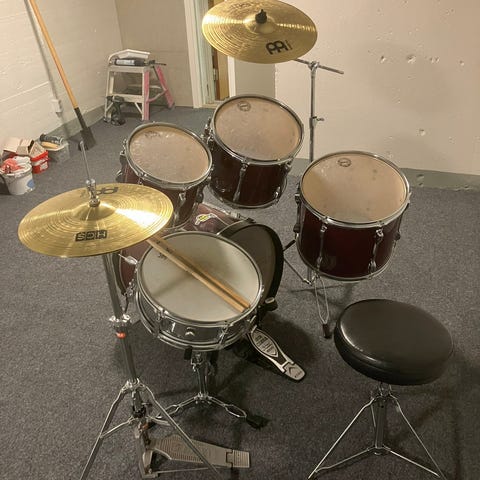Pearl Export trumset akustiskt i svart utförande. Setet består av bastrumma, virveltrumma, flera hängpukor och golvpuka. Ingår även cymbaler monterade på stativ samt hi-hat med pedal, stol och hopfällbar notställ. Trumsetet är lämpligt för övning och spel i hemmet eller replokal och kan anpassas med egna trumskinn och cymbaler vid behov.