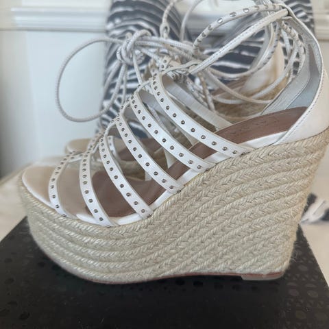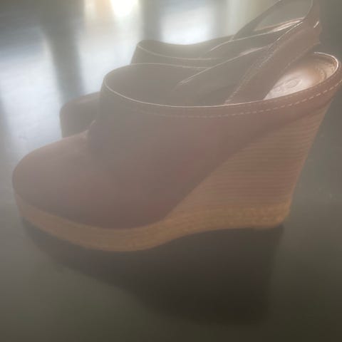 Dolce & Gabbana klackskor med kilklack 13 cm i storlek 37. Skorna har öppen tå och ovandel med leopardmönster. Kilklacken är klädd i flätat material i naturfärg. Remmar runt ankeln i brun ton. Innersula i läder med synliga sömmar. Passar som somriga klackskor vid vardag eller fest.