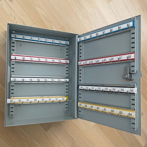 Plåtskåp med två nycklar.