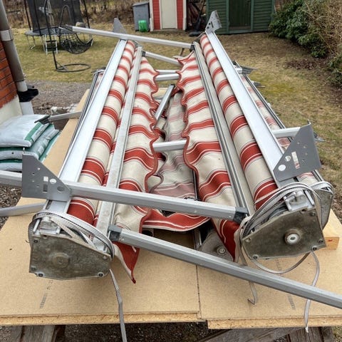5 st markiser i fint begagnat skick. I behov av tvätt men annars funkar allt. Märkta med modellnamn ”Ama”.