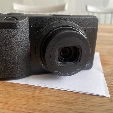 Sony Cyber-shot DSC-RX100 kompaktkamera i svart utförande. Kameran har inbyggt objektiv med Carl Zeiss-optik och justerbar zoom via reglage på ovansidan. På baksidan finns en större LCD-skärm för bildvisning och menyhantering samt knappar för bland annat meny, funktionsval och uppspelning. Ovanpå kameran finns programratt för olika exponeringslägen. Undersidan har stativfäste och batteri-/minneskortsfack. Kameran är avsedd för stillbildsfotografering och videoinspelning och passar för allmän fotografering, resor och vardagsbilder.