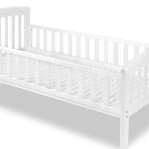 Sängen har ribbad botten och kan användas både som traditionell spjälsäng och med öppning i sidan när barnet blir större. Madrass i standardstorlek för spjälsäng ingår enligt bild.