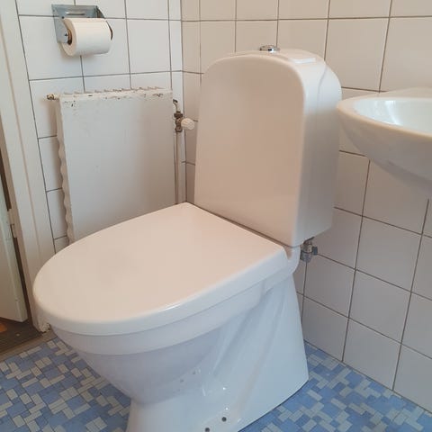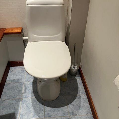 Toalettstol i vit porslin. Golvstående modell med cistern och sits. Passar för installation i badrum eller toalettutrymme där standardtoalett önskas. Anslutning mot golv och bakre vägg, avsedd för vanlig vatten- och avloppsinstallation.