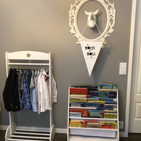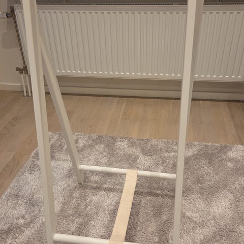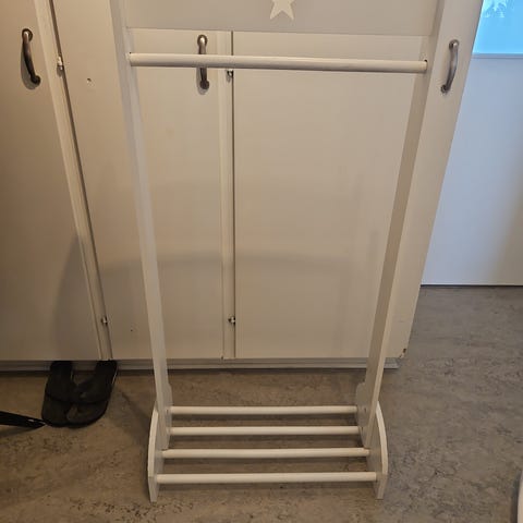 Jollyroom klädställning för barn i vitmålat trä. Ställningen har en klädstång upptill för galgar samt en nedre hylla för förvaring av skor eller andra tillbehör. Passar för barnkläder och kan placeras i barnrum, hall eller lekrum för överskådlig förvaring av kläder och ytterplagg.