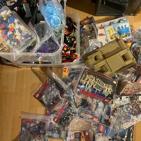 Blandat Lego. Oklart hur komplett det är. De tre små ninjago-spinners (kartonger) har inga figurer med.