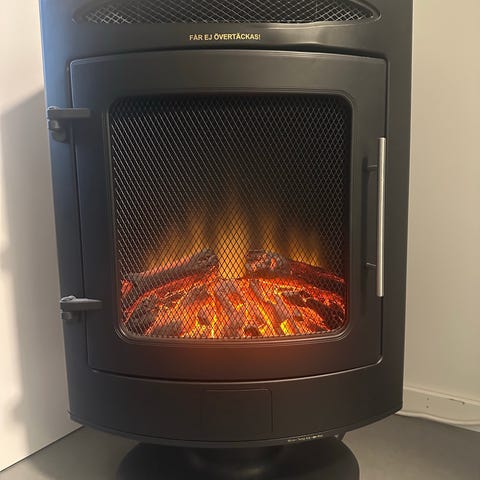 Habo Täljstens A.B. elektrisk täljstenskamin i golvmodell. Kaminen är tillverkad i täljsten med grå yta och är avsedd för inomhusbruk. Utrustad med vred för effektreglering på sidan samt strömkabel med stickkontakt. Informationsskylt anger att kaminen inte får övertäckas och att yttemperaturen kan överstiga 125 °C. Passar som extra värmekälla i bostadsrum där eluttag finns tillgängligt.