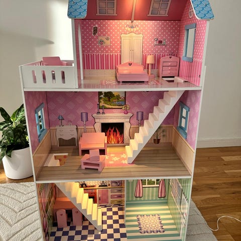 Hape dockskåp i trä med flera våningar och rum i olika färger. Huset har öppet framsida för lek, trappa mellan våningsplanen och målade detaljer som dörr och träd på utsidan. Passar för lek med mindre dockor och figurer
